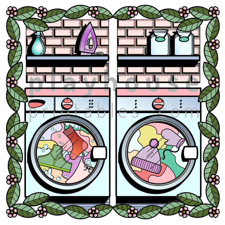 With a tumble dryer and a washing machine, this laundry room set will have them getting things clean! The little laundry features a washing machine, tumble dryer, and tiled backsplash with shelf. This coordinates with Little Sink and little Cooker, which are separately available as full color and black & white versions. For more details visit www.playhouseprintables.com.